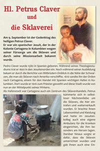 Mönch, Missionar, Priester *1580 in Verdú, Spanien Pedro Claver trat im Alter von 22 Jahren in den Jesuiten-Orden ein. Er studierte Philosophie an der Missionsschule in Mallorca, wo ihn der Pförtner Alonso Rodriguez für die Missionarbeit begeistern konnte. Pedro ging zunächst nach Westindien, dann nach Santa Fe bei Bogota, schliesslich nach Cartagena in Kolumbien, wo er zum Priester geweiht wurde. Cartagena war Zentrum des Handels mit Sklaven aus Afrika. 38 Jahre brachte er mit unermüdlicher Hilfe für diese Sklaven zu., wirkte vor allem auch in der medizinischen Versorgung und als Lehrer, er nannte sich selbst "Sklave der Sklaven". Man sagt, er habe mehr als 300.000 Menschen getauft, schon zu Lebzeiten nannte man ihn den "Apostel der Neger." Aus diesen Gründen haben wir ihn als Patron für unsere Schwesternschaft gewählt. Kanonisation: Papst Leo XIII. sprach Pedro Claver 1888 heilig und ernannte ihn 1896 zum Patron der "Mission unter Negern". Patron von Kolumbien. |